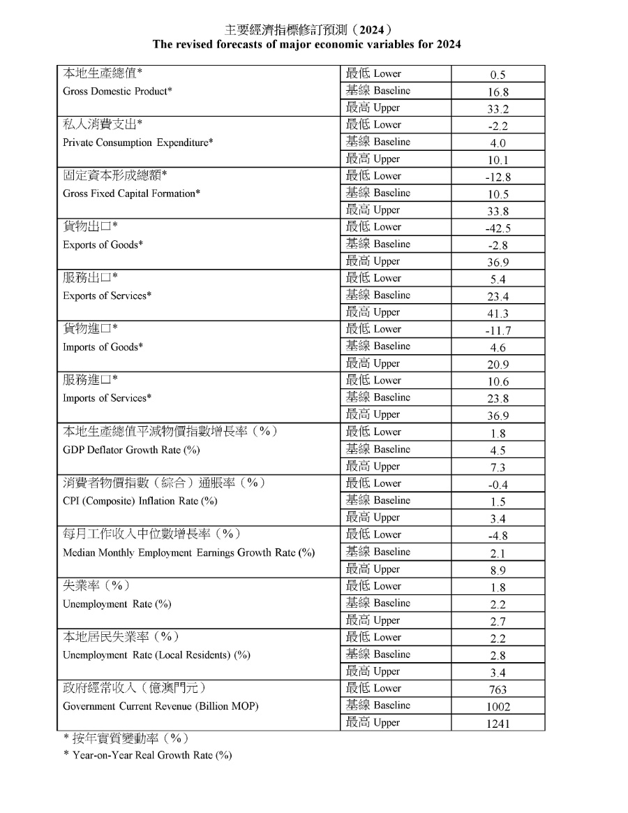 【本報消息】澳門大學澳門研究中心及經濟學系發表2024年澳門宏觀經濟修訂預測。基於2024年最新的經濟數據,並預計中國內地經濟增長放緩對澳門的影響較小,課題組修訂中國內地旅客人數的假設為2019年的90%;據此,預測澳門生產總值的基線增長為16.8%(按年實質變動率)至2019年的94.5即4,153億元(以2021年環比物量計算),而其他主要經濟變數的基線預測調整為:服務出口增長23.4%、整體...