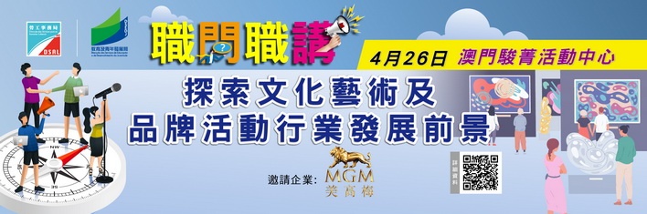 【本報消息】為配合特區政府「1+4」經濟適度多元發展策略,協助青年了解行業動態及拓寬職業發展視野,勞工事務局與教育及青年發展局將於4月26日上午11時於駿菁活動中心合辦主題為「探索文化藝術及品牌活動行業發展前景」的「職問職講」行業講座,並由即日開始接受網上報名。講座邀請美高梅品牌策劃高級副總裁廖頴琦作為主講嘉賓,她也是澳門特區政府旅遊發展委員會成員,為推動文旅、文娛、文體等各方面的發展貢獻力量,...