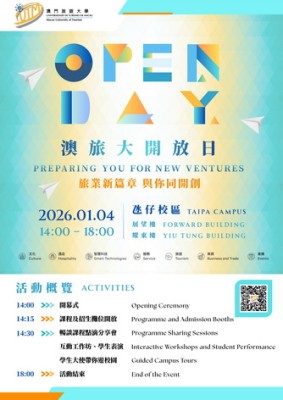 【本報消息】澳門旅遊大學將於2026年1月4日(星期日)下午二時至六時舉行2026年開放日,透過不同的精彩活動,歡迎澳門及鄰近地區學生、家長和公眾了解旅大最新的入學資訊及課程特色,體驗大學生活及校園文化。開幕式於下午二時在氹仔校區展望樓舉行,當日設有課程及招生攤位提供豐富資訊,更可即場進行學位課程報名。精彩活動包括多場課程分享會、專題講座及工作坊,由在讀學生及教學團隊分享校園生活點滴以及畢業後的職...
