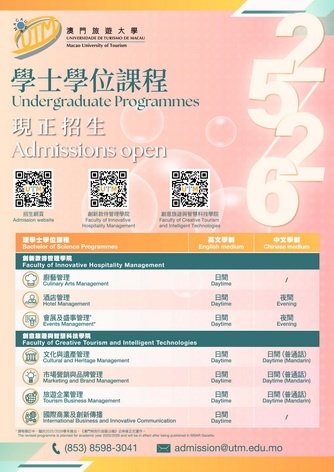 【本報消息】澳門旅遊大學一直致力培育旅遊及服務行業管理人才, 2025/2026學年學士學位課程現正接受四校聯考考生報名,由即日起至1月16日止。是次招生的學位課程包括「文化與遺產管理」、「廚藝管理」、「酒店管理」、「會展及盛事管理」(此為修訂課程,預計於2025/2026學年推出)、「旅遊企業管理」、「市場營銷與品牌管理」及「國際商業及創新傳播」,部分課程同時設有英文學制及中文學制,為有志投身...