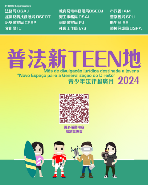 【本報消息】為持續提升青少年及市民大眾知法和守法的意識,由12個政府部門組成的「青年政策」跨部門跟進小組將由九月起至11月繼續合辦2024「普法新TEEN地」青少年法律推廣月,期間將舉辦近30項線上線下的普法活動。合辦部門將於活動期間舉辦多場普法講座,主題涵蓋《憲法》、《澳門基本法》、《國旗、國徽及國歌的使用及保護》、《預防及控制未成年人飲用酒精飲料制度》、《禁止不法生產、販賣和吸食麻醉藥品及精神...