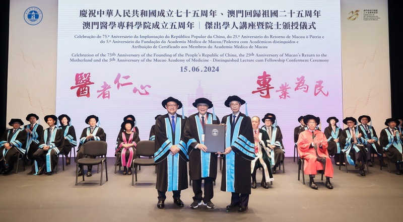【本報消息】衛生局轄下澳門醫學專科學院為慶祝成立五周年於日前舉行傑出學人講座暨2024年度院士頒授儀式。儀式由社會文化司司長歐陽瑜、社會文化司司長辦公室主任何鈺珊、衛生局局長羅奕龍、香港醫學專科學院主席梁家傑、香港大學李嘉誠醫學院院長劉澤星、澳門醫學專科學院專業委員會主席熊志添共同主禮。此外,還有20多位來自內地及香港的嘉賓、本澳醫療機構代表及澳門醫學專科學院架構成員等出席了典禮。歐陽瑜在院士頒授...