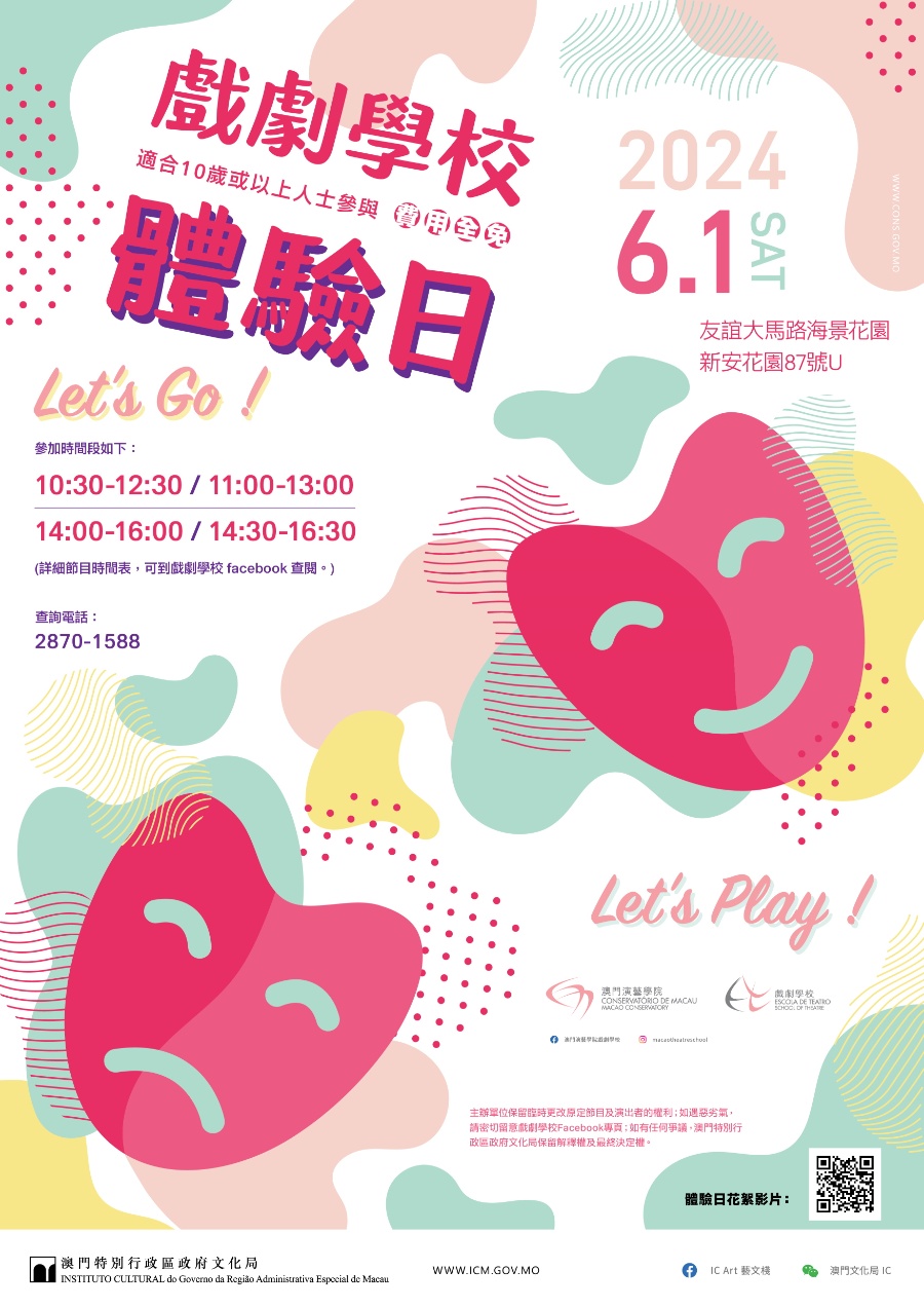 【本報消息】文化局轄下澳門演藝學院將於6月1日在戲劇學校舉辦「澳門演藝學院戲劇學校體驗日2024」,活動由即日起接受報名,歡迎10歲或以上對戲劇有興趣的人士參與。演院戲劇學校體驗日2024將於6月1日上午10時半至中午一時、下午二時至四時半在友誼大馬路新安花園校址進行,活動內容豐富,參加者可透過短劇欣賞和實地場景體驗,感受戲劇課程的樂趣,舞台設計及道具製作展覧區將設有不同主題的場景及設計作品展示...