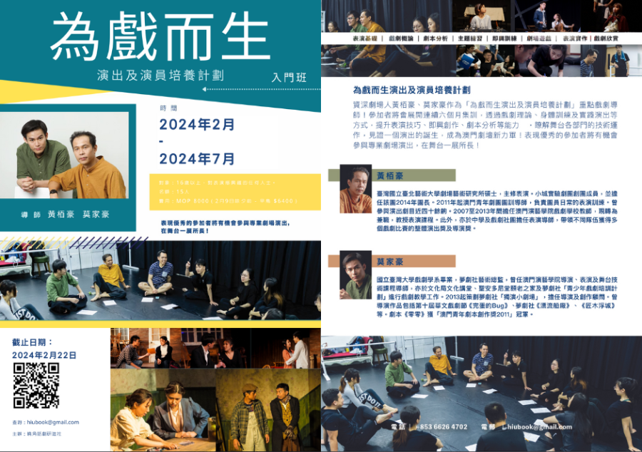 【本報消息】曉角話劇研進社第二屆「為戲而生演出及演員培養計劃」現正招募入門班學員,邀請資深劇場人黃栢豪、莫家豪作為重點戲劇導師。參加者將會展開連續六個月集訓,透過戲劇理論、身體訓練及實踐演出等方式,提升表演技巧、即興創作、劇本分析等能力,瞭解舞台各部門的技術運作,見證一個演出的誕生,成為澳門劇壇新力軍。表現優秀的參加者將有機會參與專業劇場演出,在舞台一展所長。計劃希望能培養全方位劇場人,強調熱身活...