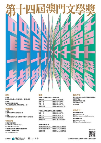 【本報消息】由澳門基金會及澳門筆會合辦的第14屆「澳門文學獎」現正接受報名,截件日期至2月5日。比賽分本地組及公開組兩組。本地組設散文、新詩、劇本、短篇小說及中篇小說五文類,凡持有有效澳門居民身份證人士均可以原創作品參賽;公開組設散文及短篇小說兩文類,參賽人士不限國籍及居住地,凡於2021年1月1日至2023年12月31 日期間在澳門或海內外華文報刊刊發,並以書寫澳門為主軸內容的作品均可參賽。參...