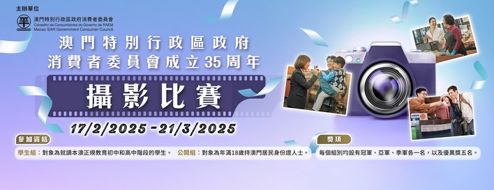 【本報消息】為慶祝消費者委員會成立35周年,消委會舉辦攝影比賽,藉參賽者捕捉商號和居民融洽消費的瞬間剪影,呈現澳門誠信友愛、和諧愉快的優質消費環境。是次攝影比賽分學生組和公開組兩個組別。學生組對象為就讀本澳正規教育初中和高中階段的學生;公開組對象為年滿18歲持澳門居民身份證人士。兩個組別分別設有冠、亞、季軍各一名,以及優異獎五名。是次比賽評審團由消委會及澳門攝影學會代表組成,得獎者將獲頒發獎座、...