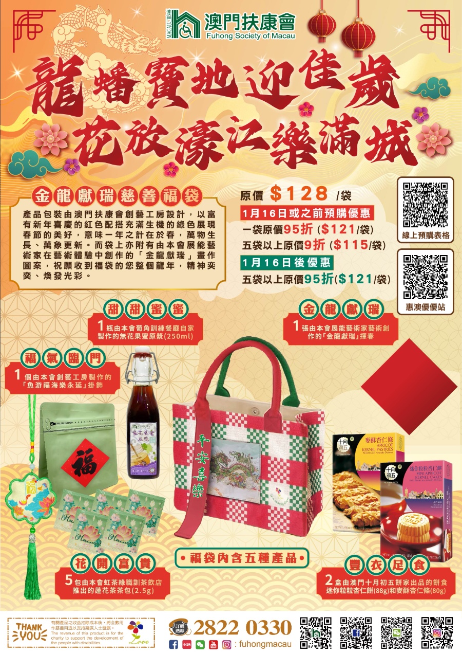 【本報消息】臨近新春澳門扶康會推出2024 新年禮品「金龍獻瑞」慈善福袋,今年的主題是「龍蟠寶地迎佳歲 花放濠江樂滿城」, 福袋包裝由扶康會創藝工房設計,以富有新年喜慶的紅色配搭充滿生機的綠色展現春節的美好,意味一年之計在於春,萬物生長、萬象更新。袋上亦附有由該會展能藝術家在藝術體驗中創作的「金龍獻瑞」畫作圖案,祝願收到禮袋的您整個龍年,精神奕奕、煥發光彩。「金龍獻瑞」福袋慈善價為原價128澳門元...