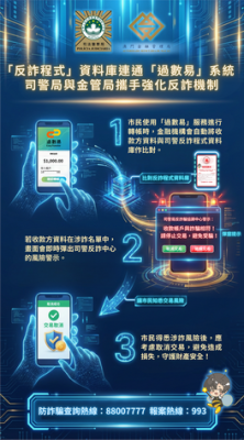 【本報消息】為進一步加強防範電訊網絡詐騙,司法警察局與金融管理局透過「反詐騙聯動機制」合作優化「詐騙帳戶預警」措施,正式連通「反詐程式」資料庫和「過數易」快速支付系統,並協調金融機構在「過數易」加入識別可疑收款帳戶的功能,讓市民在進行「過數易」跨行轉帳操作時,可即時獲取倘有的風險提示,以及時識別潛在詐騙風險。司警局一直與金管局及本澳金融業界保持緊密合作,自2017年起先後推出「緊急止付」、「線下可...
