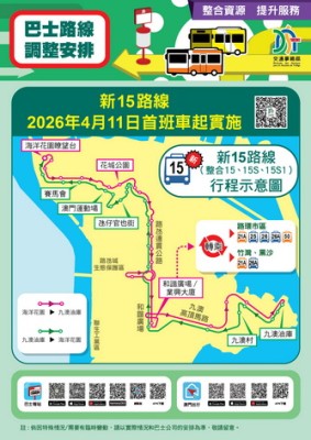 【本報消息】為優化公共資源配置,交通事務局持續透過數據分析客流,並與兩間巴士公司協調,推動路線重組與站點優化。4月11日起將實施新15路線的巴士服務,並調整52路線的行程,透過整合資源、加密班次、擴大覆蓋,為市民提供更便捷的巴士服務。4月11日起,由現時15、15S及15S1路線合併的新15路線將以往返海洋花園及九澳村的路線運作,班次頻率將加密到22至26分鐘。當中,將新增往來九澳高頂馬路及九澳...