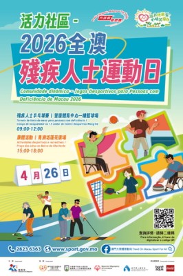 【本報消息】由體育局主辦,社會工作局、中國澳門殘疾人奥委會暨傷殘人士文娛暨體育總會、澳門特殊奧運會及澳門聾人體育會協辦的「活力社區—2026全澳殘疾人士運動日」,將於4月26日舉行。「活力社區—2026全澳殘疾人士運動日」活動有兩部分,其中殘疾人士乒乓球賽於活動當日上午九時至中午12時在望廈體育中心一樓籃球場舉行;而康體活動則於同日下午三時至六時在青洲坊蓮花廣場舉行,現場設有多個適合不同能力人士參...