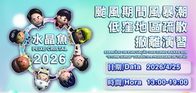 【本報消息】隨著本澳颱風季節即將來臨,為強化社區防災意識,民防架構將於4月25日星期六下午一時至七時,進行代號「水晶魚2026」民防颱風演習。是次演習模擬本澳受超強颱風「水晶魚2026」正面吹襲,氣象局一度發出10號風球及黑色風暴潮警告信號,低窪地區出現嚴重水浸,並引發多宗突發事故。屆時,民防架構將透過實地和桌上方式演練多項應急救援行動,並同步執行「颱風期間風暴潮低窪地區疏散撤離專項應變計劃」,參...
