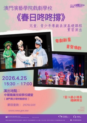 【本報消息】文化局轄下澳門演藝學院戲劇學校將於4月25日(周六)下午三時半,在中葡職業技術學校禮堂舉行2025/2026學年兒童及青少年粵劇表演基礎課程實習演出《春日咚咚撐》,門票由4月13日上午10時起於一戶通接受登記,費用全免。是次實習演出由約25位年齡介乎7至14歲的「兒童、青少年粵劇表演基礎課程」初階學員參與,將呈獻多段精彩粵劇折子戲及基本功展示,讓學員在舞台上展現所學,累積表演經驗。此外...