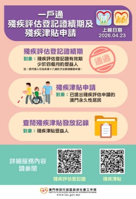 【本報消息】為配合特區政府電子政務發展,社會工作局由4月23日起於一戶通提供殘疾評估登記證續期及殘疾津貼申請服務。凡持有效期少於四個月的殘疾評估登記證受益人,可透過一戶通辦理續期申請。受益人只須於一戶通帳戶內選取殘疾評估登記證續期服務,填寫個人資料及上載照片,核對資料無誤後進行面容識別,即可完成相關申請程序。此外,原代理人更可透過一戶通個人帳戶為未滿18歲的子女辦理續期申請,操作方式與個人申請大致...