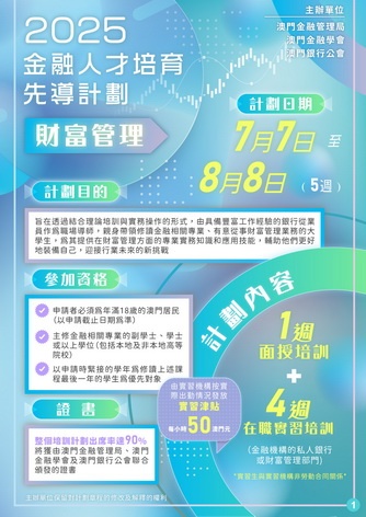 【本報消息】為配合特區政府「1+4」經濟適度多元發展策略,培育及儲備現代金融新業態所需的專業人才,金融管理局聯同金融學會及銀行公會於今年暑假續推「金融人才培育先導計劃—財富管理」,為有志投身財富管理領域的在讀學生,提供系統化及具針對性的培訓及實習機會,助力學員提升職場技能及就業競爭力。今年先導計劃將於7月7日至8月8日進行,為期五周,延續「面授+實習」模式進行。首周將進行財富管理的面授課程,奠定...