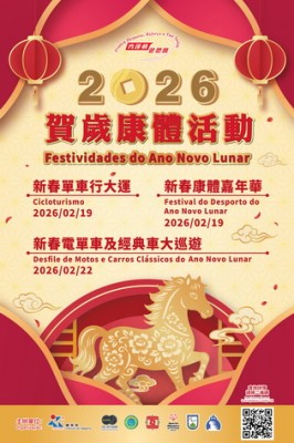 【本報消息】為喜迎甲午馬年的來臨,體育局將於農曆正月初三(2月19日)及初六(2月22日)深入社區舉辦「2026賀歲康體活動」,系列活動包括「新春單車行大運」、「新春康體嘉年華」及「新春電單車及經典車大巡遊」,歡迎全澳市民及旅客踴躍參與。活動內容豐富,尤其適合家庭親子同樂,讓大家在歡度佳節的同時,也能透過多元化的康體活動鍛鍊身心。由體育局與中國澳門單車總會合辦的「新春單車行大運」,將於農曆正月初三...