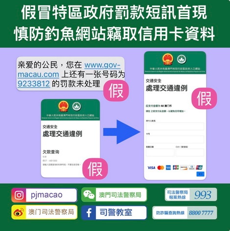 【本報消息】司警局於近日發現有騙徒假冒澳門特區政府名義向市民隨機發送虛假手機短訊,訛稱市民有罰款需要點擊短訊內附帶之連結處理,有關連結進入後為一個假冒「澳門特別行政區政府入口網站」的網頁,倘市民按照頁面要求輸入車牌號碼查詢後,會訛稱市民有「交通違例」罰款需要透過信用卡繳交,以此套取市民信用卡資料後隨即進行未經授權之大額交易,令市民蒙受損失。司警局反詐騙協調中心呼籲交通違例通知短訊僅會通知車主已被...