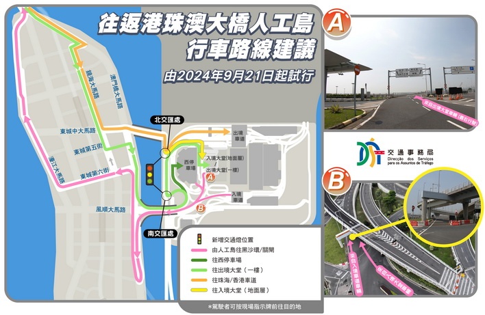 【本報消息】為配合澳門大橋即將通車以及新城A區共同管道施工,本周六起將率先開通連接新城A區與港珠澳大橋之間的風順大馬路口岸人工島連接橋,以及A區多條道路,屆時由A區往返人工島的行車路線將會有所調整,而港珠澳口岸環形馬路將新增兩組交通燈。當局指開通新路道後將有助分流車輛和減少車流交織情況,提升通行效率。 公共建設局和交通事務局周四下午共同舉行「新城A區...