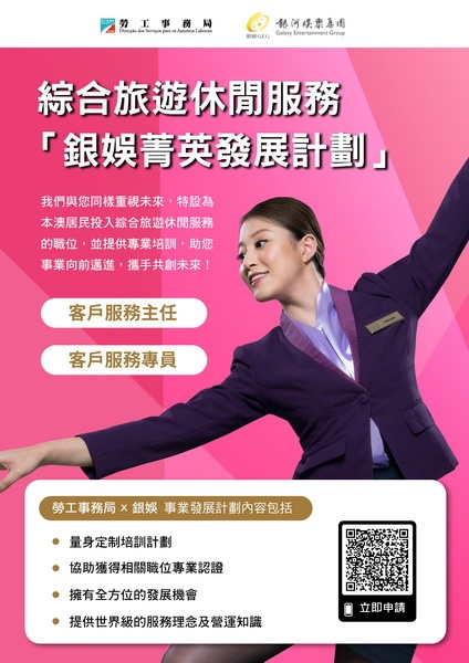 【本報消息】為支持本地人才全面發展,拓展多元職涯路向,勞工事務局與銀娛合作推出「銀娛菁英發展計劃(綜合娛樂服務範疇)」,以「先入職、後培訓」方式,為有志投身綜合旅遊休閒服務行業的澳門居民提供全方位培訓及事業發展機會,計劃由8月27日起接受申請。計劃提供「客戶服務專員」職缺20個及「客戶服務主任」職缺10個,合共30個職缺。獲錄取參加計劃者,將接受一系列培訓及工作實踐。培訓內容包括客戶服務基礎課程、...