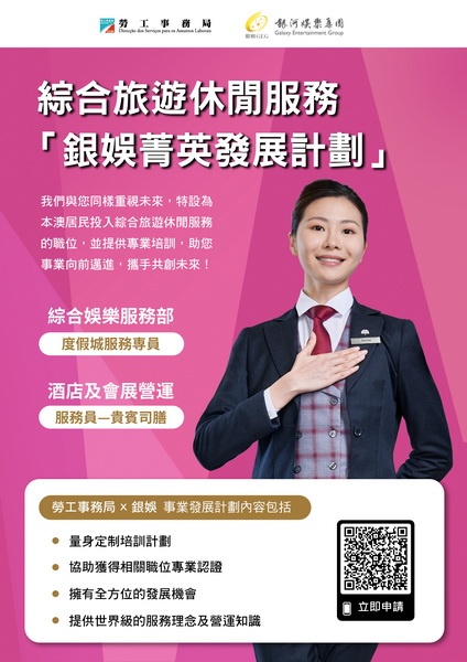 【本報消息】為支持本地人才全面發展,拓展多元職涯路向,勞工事務局和銀河娛樂集團合作推出「銀娛菁英發展計劃(綜合娛樂服務及酒店營運範疇)」,以「先入職、後培訓」方式為有志投身綜合休閒旅遊服務行業的澳門居民提供全方位培訓及發展階梯,計劃由8月13日起接受申請。計劃提供「度假城服務專員」職缺五個及「服務員—貴賓司膳」職缺15個,合共20個職缺。獲錄取參加計劃者,將接受一系列專業培訓及工作實踐,培訓內容包...