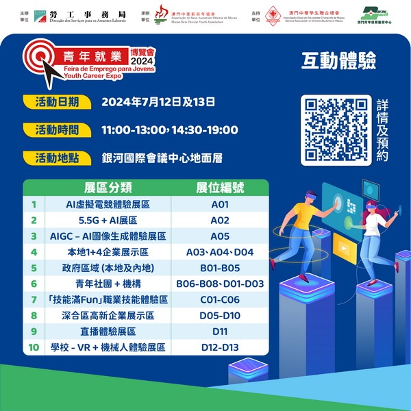 【本報消息】定於7月12日至13日假銀河國際會議中心舉行的「青年就業博覽會 2024」,今年主題為「展.未來新視界、探.·就業新動向」,博覽會期間場館內設多項活動,包括有論壇、「1+4」行業講座、互動體驗展區等,並由7月2日起網上接受預約進場。32個單位參展設於GF層全場,分別有政府部門、澳門及內地企業、青年社團及機構、學校等組成,劃分成 10個展區,當中有六個展區提供互動體驗,展示新質生產力推動...