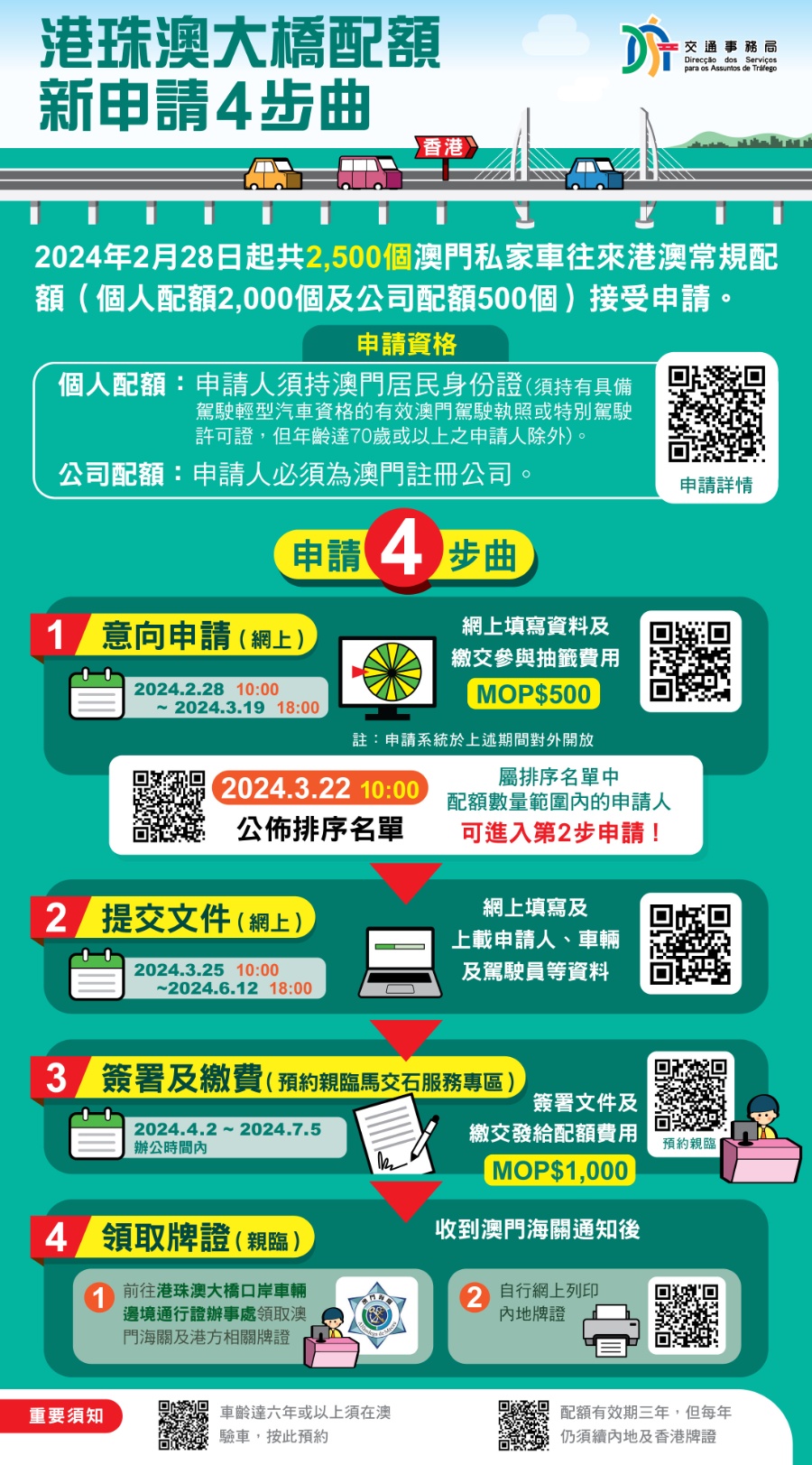 【本報消息】為回應居民使用港珠澳大橋往來港澳的需求,特區政府推出2,500個澳門私家車往來港澳常規配額予公眾申請,當中個人配額2,000個、公司配額500個。根據申請要求,個人配額的申請人必須持有澳門居民身份證(須持有具備駕駛輕型汽車資格的有效澳門駕駛執照或特別駕駛許可證,但年齡達70歲或以上之申請人除外);公司配額的申請人必須為澳門註冊公司。有意申請人士可由即日起至3月19日下午六時前透過交通...