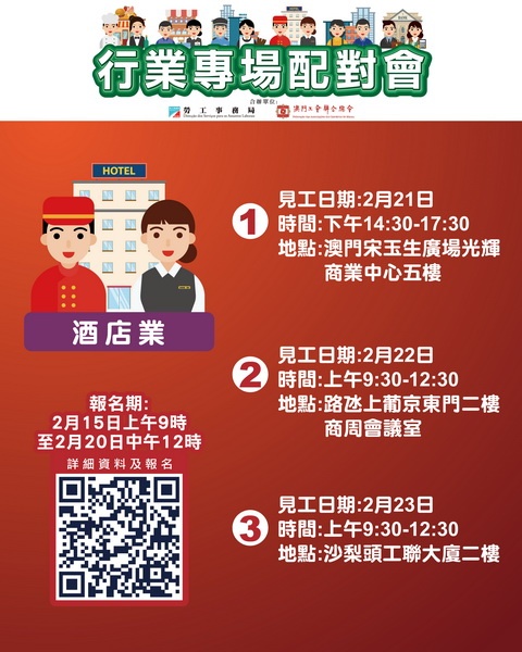 【本報消息】為協助有求職需求的澳門居民盡快就業,以及為緩解業界的人資需求的壓力,勞工事務局與工聯合作於下星期舉辦三場行業專場配對會,合共提供74個空缺。報名日期由2月15日至2月20日中午12時。2月21日下午舉辦酒店業配對會,提供18個職位空缺,涉及保安員、給排水系統主任、特殊效果主任、影音系統高級技術員、樓宇維護高級技術員及電氣技術員等。配對會在澳門宋玉生廣場光輝商業中心五樓舉行。2月22日...