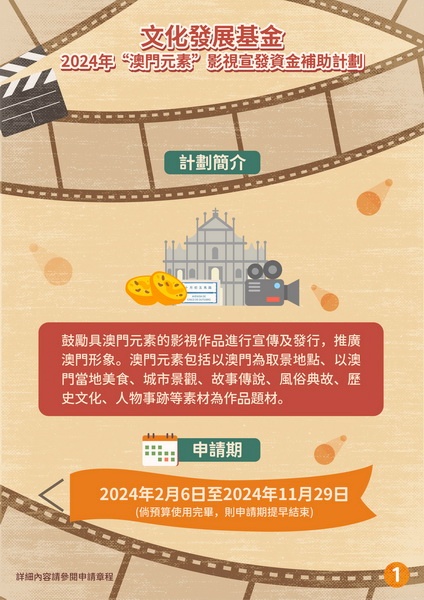 【本報消息】文化發展基金推出「澳門元素」影視宣發資金補助計劃和「澳門取景」影視拍攝資金補助計劃,支持具澳門元素影視作品投入市場,加強宣傳澳門城市形象及提升國際知名度,帶動文創及旅遊的聯動性,推動澳門影視產業發展。兩項資助計劃由2月6日起接受申請,最後接受申請限期為2024年11月29日,資助名額不限,直至相關資助計劃預算使用完畢為止,屆時申請期將同時提早結束,基金將在網站對外公佈有關訊息。兩項計...