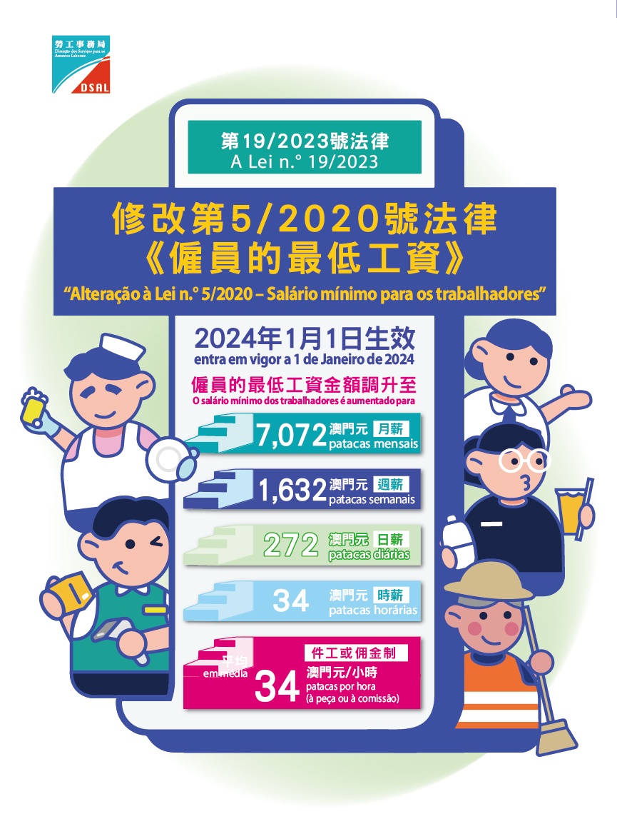 【本報消息】勞工事務局表示,最低工資金額調升將由2024年1月1日起生效,調升後的僱員最低工資金額分別為按月計算報酬,每月澳門元7,072元;按周計算報酬者每周工資1,632元;按日計算報酬每日272元;按小時計算報酬每小時34元;按實際生產結果計算報酬平均每小時34元。 勞工局指第5/2020號法律《僱員的最低工資》已於2020年11月1日生效,根據該法律的規定,最低工資金額須於...