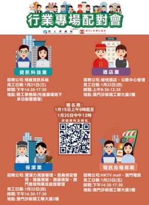 【本報消息】勞工事務局與工聯將於下星菅合作舉辦四場行業專場配對會,合共提供309個職位空缺。1月21日下午舉辦博維資訊系統有限公司專場配對會,提供12個職位空缺,涉及系統研發部項目經理、系統分析員、電腦技術員及安防弱電技術員等崗位。1月22日上午舉辦酒店業專場配對會,參與企業有城悅酒店(澳門)及公教中心管理有限公司,合共提供51個職位空缺,涉及客戶服務經理、客房主任、安全主任、工程技工及房口部服務...