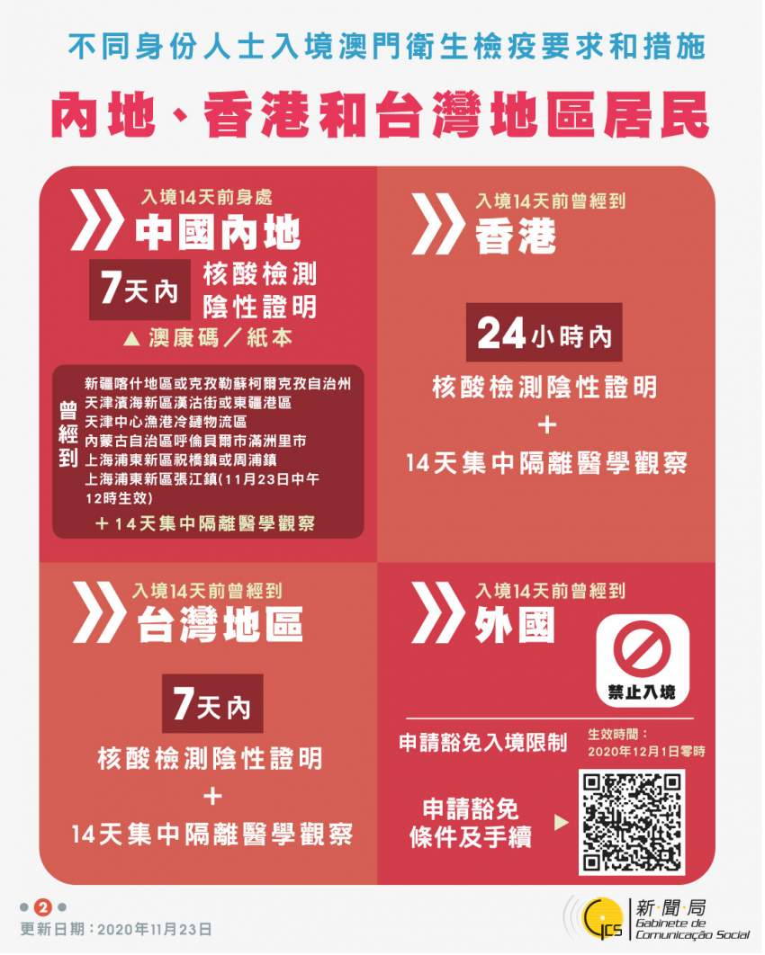 目前,入境本澳前14天內曾經到過新疆喀什地區、克孜勒蘇柯爾克孜自治州;天津演海新區漢沽街、東疆港區、中心漁港冷鏈物流區;內蒙古自治區呼倫貝爾市滿州里市;上海浦東新區祝橋鎮、周浦鎮、張江鎮的人士,需要到衛生局指定地點進行14天醫學隔離觀察。