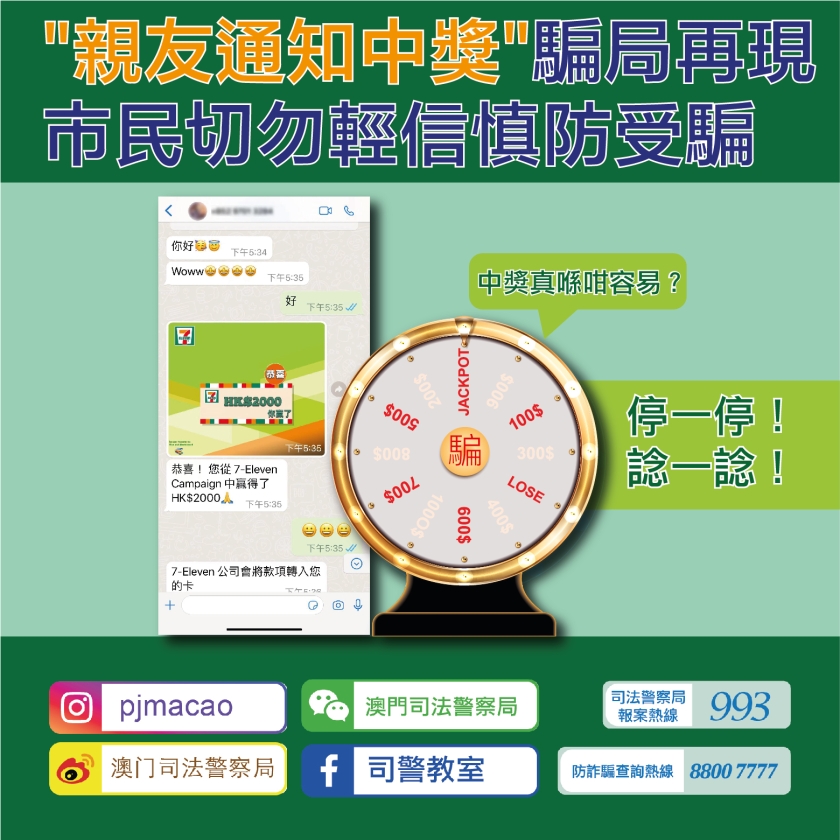 【本報消息】司法警察局再接獲市民檢舉,指收到「朋友」的Whatsapp訊息,稱事主於7-11便利店舉辦的抽獎活動中獲得獎金2,000元,要求事主提供信用卡照片及一次性驗證碼,以便將獎金存入事主的信用卡內。由於對方的頭像為其朋友,故事主相信並照辦,其後事主手機收到多筆信用卡交易短訊方知被騙,遂向司警局報案求助。