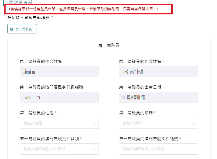 局方提醒「更換駕駛員」之申請人,須填寫新組合中所有駕駛員的資料,以免影響相關人士的駕駛資格。此外,申請人須留意「國際通行許可證」和「封閉道路通行許可證」的新證領取及舊證交還地點已調整為馬交石服務專區,且無需駕駛原配額車輛前往路氹城汽車檢驗中心檢視。