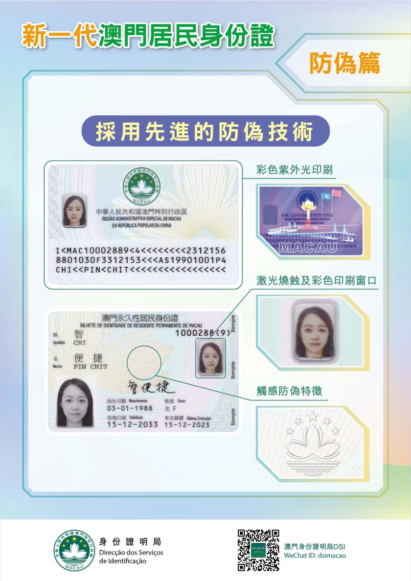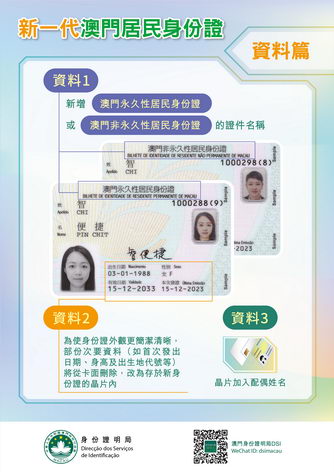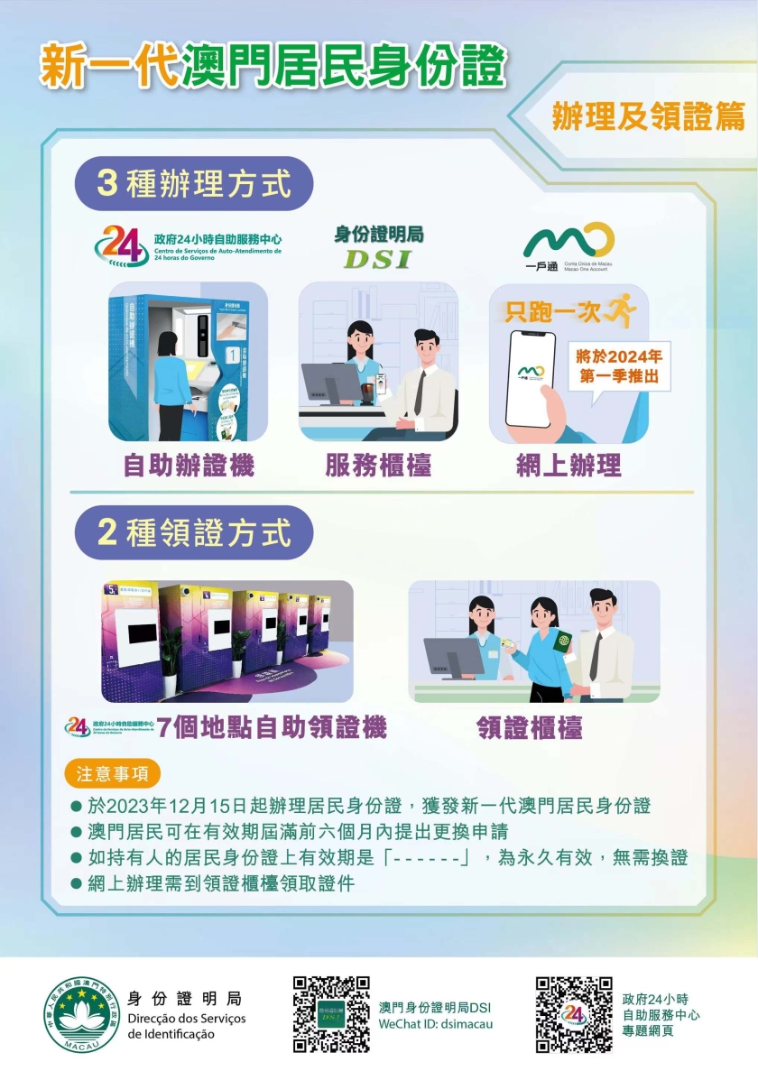 因應推出新居民身份證,身份證明局需要對相關系統進行升級,故將於12月15日至2024年1月12日期間暫停接受居民身份證的特別加快申請,居民如有緊急需要或查詢,可致電2837-0777/2837-0888或電郵至info@dsi.gov.mo。有關辦證詳情可查閱身份證明局網頁(www.dsi.gov.mo)。