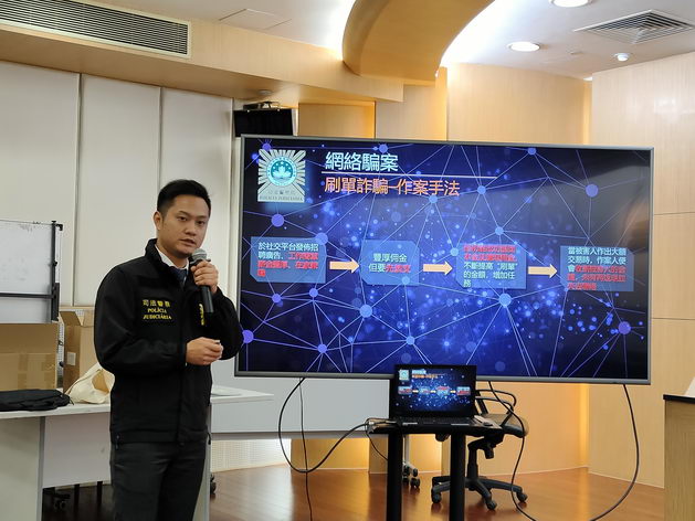 去年10月至今年四月期間司警先後接獲九名事主報案,報稱自己墮入網上兼職刷單騙局,眾人合共損失77萬元。司警經調查後發現幕後涉及一個由去年10月開始運作的詐騙集團,涉案集團於網上社交平台發放相關詐騙廣告,除上述九宗案件外還揭發涉及另外16宗案件(14宗兼職刷單和兩宗殺豬盤),25名事主合共被騙走196萬元。
