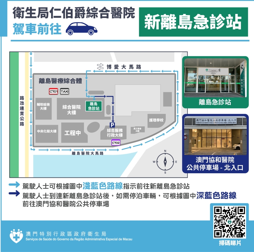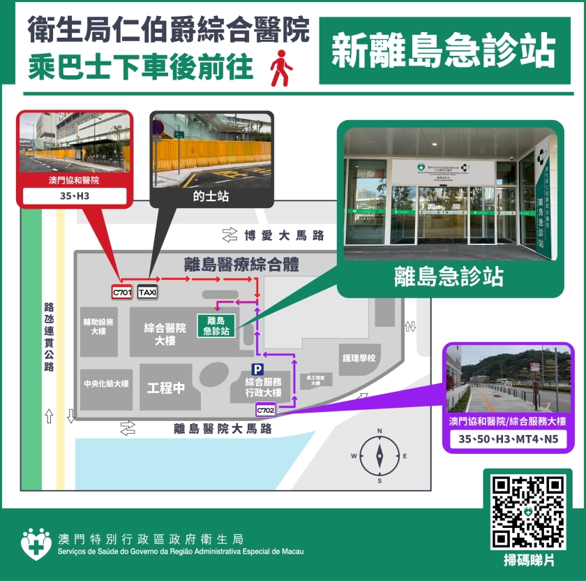 至於原設在氹仔偉龍馬路科大醫院的仁伯爵綜合醫院離島急診站則於同一時間停止接收掛號就診,在完成處理現場已掛號的就診者後,正式停運。