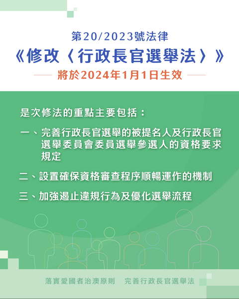 第20/2023號法律主要從三方面優化行政長官選舉的管理及流程,包括完善行政長官選舉的被提名人及行政長官選舉委員會委員選舉參選人的資格要求規定;設置確保資格審查程序順暢運作的機制;加強遏止違規行為及優化選舉流程。