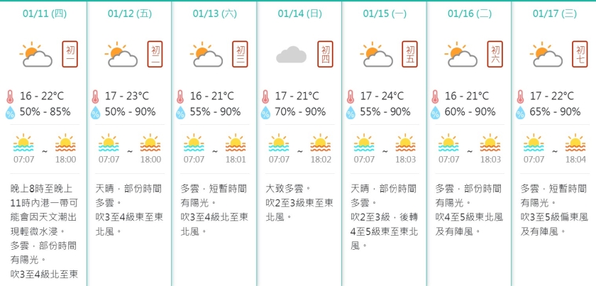 事實上,入冬後本澳轉受東北季風影響,但吹來的冷空氣都較弱,未有為本澳帶來猶如早前聖誕假期般的大降溫,周四本澳就會進入「腊月」,即農曆十二月,下周六更將迎來「大寒」節氣,不過未來一周本澳最低氣溫將維持在16度至17度之間,最高氣溫有21度至24度,且屬天晴部份時間有陽光的天氣。