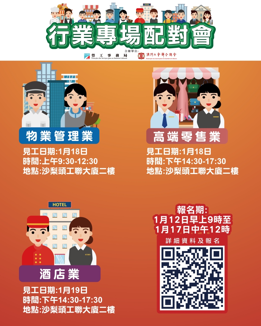 1月19日下午舉辦酒店業配對會,提供135個職位空缺,涉及前台值班經理、會計部經理、資訊科技部經理、人力資源部主任、樓層主任、保安主任、審計員、文員、電腦技術員、歷史導賞員、工程技工、前台服務員、餐飲服務、房務員及保安員等。
