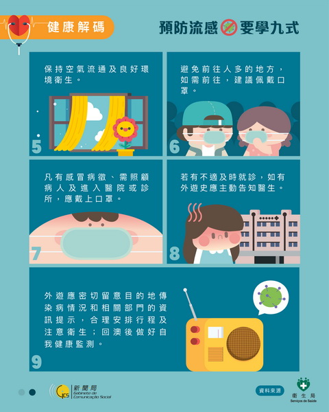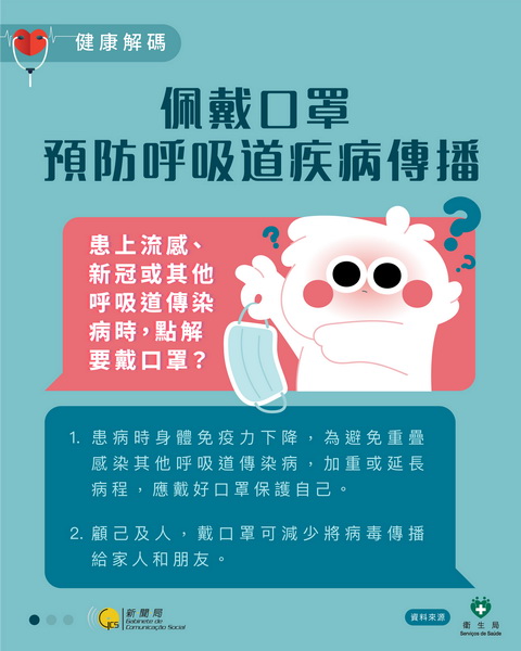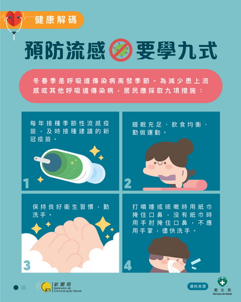 今年1月1日至今本澳共錄得八例流感併發肺炎的流感重症,病例由5歲至81歲,包括四男四女,當中只有三人已接種流感疫苗。衛生局再度呼籲尚未接種的高風險人群,包括孕婦、長者、慢性病患者儘快接種當季的流感疫苗和建議的新冠疫苗;同時為減少患上流感和其他上呼吸道傳染性疾病,居民應採取個人措施進行預防。