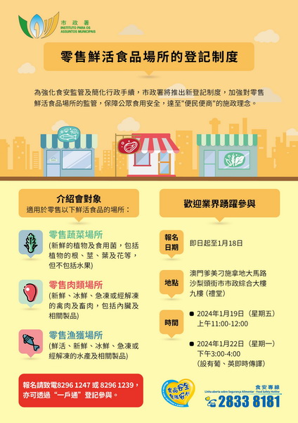 為加強食品業界對登記制度的認識,市政署將於本月19日及22日在沙梨頭街市市政綜合服務大樓九樓禮堂舉辦兩場登記制度介紹會,第一場舉辦時間為1月19日(星期五)上午11時至12時;第二場舉辦時間為1月22日(星期一)下午三時至四時。屆時市政署代表將就登記制度的適用對象、申請手續、營運場所要求、公示制度及執法制度等作詳細解說,並即場解答疑問。有興趣人士由即日起至1月18日期間可透過「一戶通」向署方報名,或於辦公時間內致電8296 1247或8296 1239報名或查詢。