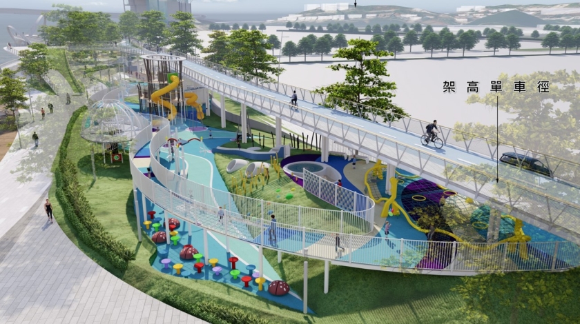 署方介紹,整個片區將透過山丘起伏的微地形設計,在增加綠化及遮蔭同時,融入兒童遊玩空間,引入適合不同年齡層的新穎遊樂設施,例如坡度攀爬區、鑊形滑梯、空中天橋等為遊樂區豐富層次及空間趣味性。於區內較寬闊的區域設置親子腳踏車場,有條件提供較長的路線,全長250米;車道設計將參考澳門東望洋跑道,家長小童可一同遊玩人力腳踏車,也設有幼兒訓練區及幼兒挑戰區的平衡車場,供較幼齡兒童使用。