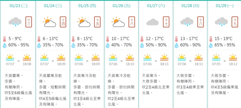 鄰埠香港天文台預料受強烈冬季季候風影響,當地周二至周三天氣漸轉嚴寒,密雲,有幾陣雨,周二市區氣溫會下降至最低約7度,新界再低幾度,高地更有可能結冰,同時,由於風勢頗大,「風寒效應」明顯,體感溫度會比實際氣溫低,呼籲居民注意保暖,並盡量避免長時間逗留在大風地方。