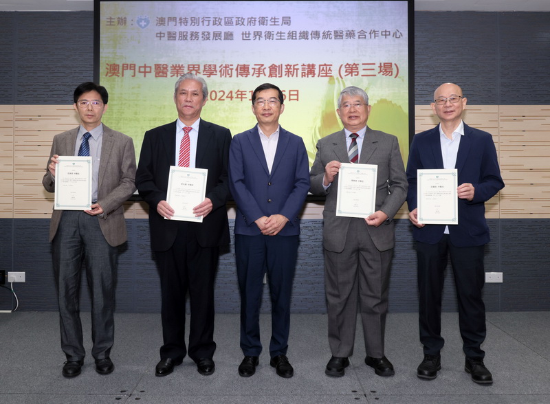 【本報消息】為發掘和傳承本地中醫診療特色及技術,推動本澳中醫事業發展,日前衛生局中醫服務發展廳和世界衛生組織傳統醫藥合作中心(澳門)共同舉行第三場「澳門中醫業界學術傳承創新講座」,邀請郭光龍、周稀鳴、石崇榮、莊耀良四位具有多年經驗的本地老、中、青年中醫作為主講嘉賓,與中醫業界分享臨床經驗及交流從業心得。