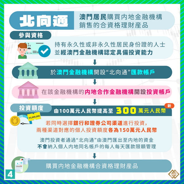 按照金管局新頒佈的《實施細則》,除了澳門銀行可開展「跨境理財通」業務外,獲許可在澳門提供證券服務的金融機構(證券公司)亦可按照《實施細則》的規定開展「跨境理財通」業務。另外,投資者可購買更多元的合資格理財產品,其個人投資額度亦由100萬元人民幣提升至300萬元。投資者若同時選擇銀行和證券公司渠道進行投資,兩種渠道對應的個人投資額度各為150萬元。