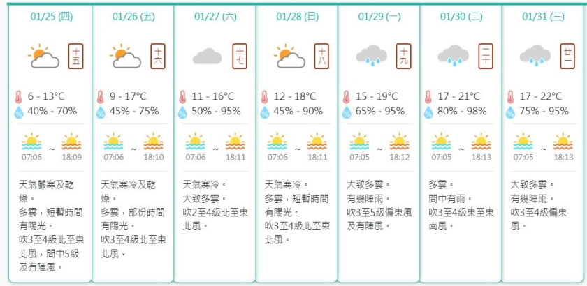 氣象局預測周五最低氣溫只有九度或以上,最高氣溫則為17度,天氣持續寒冷及乾燥,多雲,部份時間有陽光,吹三至四級北至東北風,相對濕度介乎百分之45至70之間,仍然屬乾燥。周末期間同樣持續寒冷,周六最低氣溫可望回升至10度或以上,並維持多雲部份時間或有陽光的天氣。
