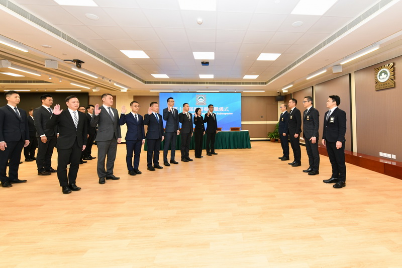 【本報消息】司法警察局25日先後舉行二等督察及副督察就職儀式。在局長薛仲明主禮及監誓下,賴文威、岑錦榮、陳仲賢、賴釗洪、陳麗貞、蔡昕暉、陳煥文、謝炳權、梁國晞、鄔志良等10位副督察宣誓就任二等督察,呂志斌、張韶強、譚敏堅、鍾錦良、郭彬彬、劉永權、林弋、龍漢威、伍志剛、趙朱惠敏、曾志輝、黎尚文、何棣明、許惠斌、劉鎮威及鄭志輝等16位首席刑事偵查員宣誓就任副督察。
