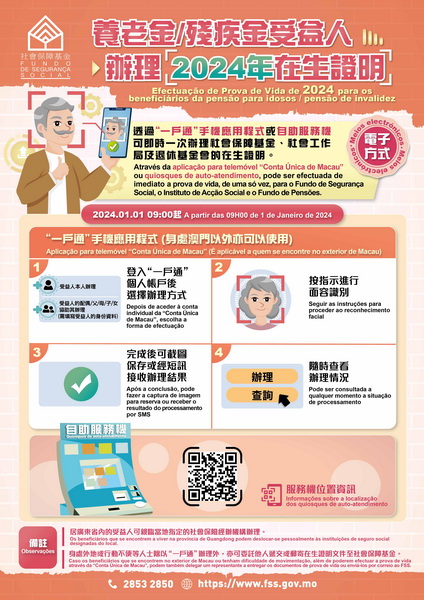 受益人亦可攜有效澳門居民身份證透過24小時運作的自助服務機等方式辦理在生證明,所有方式均可一次性辦理社保基金、社會工作局及退休基金會的在生證明。如有疑問,可瀏覽社保基金網站 www.fss.gov.mo,或致電2853 2850查詢。
