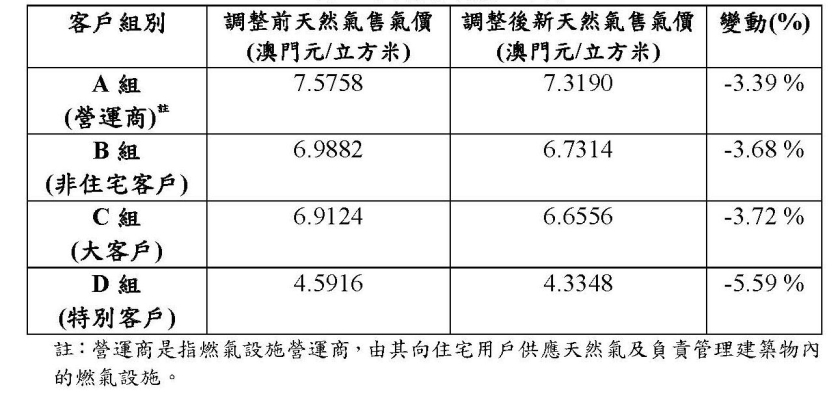 根據批示,調整後的四個客戶組別售氣價格分別下調約 3.3%至 5.5%,其中向住宅客戶供氣的營運商(A組)售氣價格降幅 3.3%,每立方米約 7.3 1澳門元。不過對比行政長官於去年同意天然氣售氣價格上調的31/2023號行政長官批示加幅,今次減幅僅為上次加價幅度的三至四成,其中以向住宅客戶供氣的營運商(A組)售氣價格為例,去年加幅達8.23%,而今次降幅則僅為 3.3%。