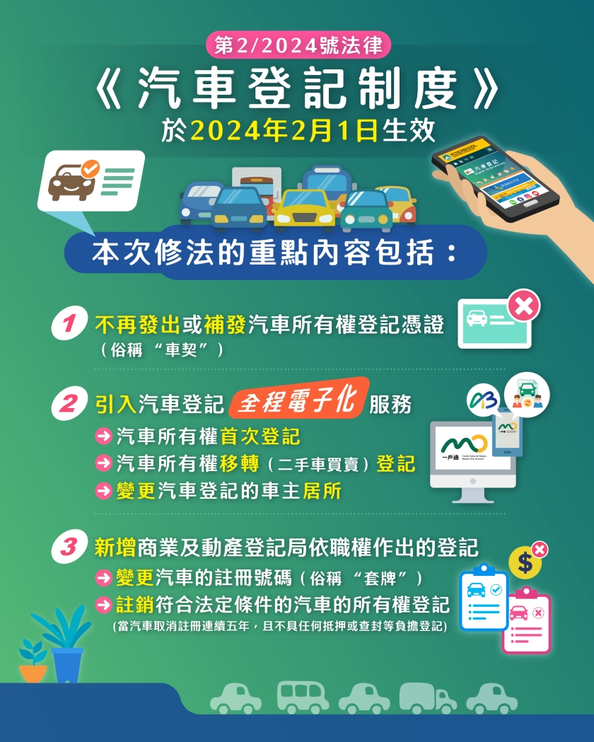 【本報消息】《汽車登記制度》周四起生效,市民可透過「一戶通」或「商社通」辦理機動車輛所有權登記服務,實現汽車登記全程電子化;與此同時,政府將不再發出俗稱「車契」的汽車所有權登記憑證,已發出的車契會維持有效,市民可透過法務局的汽車登記訊息平台查閱汽車是否具有有效的車契。