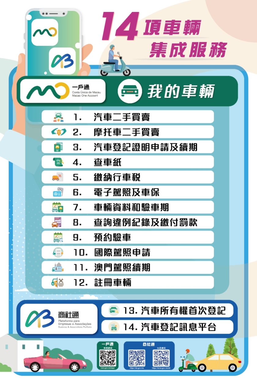 他表示,現時「一戶通」與「商社通」合共提供14項車輛集成服務,為車主及駕駛者提供更方便的體驗,亦減少市民親身前往各部門提交申請和處理事務的需要;截至今年1月10日,全澳逾25萬輛機動車輛中有近18萬部,即超過七成的車輛已於「一戶通」完成綁定;同時,已超過16萬人完成綁定電子駕照,以及綁定了16萬份車保。另有38萬宗以「一戶通」繳付交通違例罰款個案,以及有2.8億澳門元行車稅款在「一戶通」完成繳納,當局認為數字反映市民已普遍接受使用「一戶通」的「我的車輛」功能。
